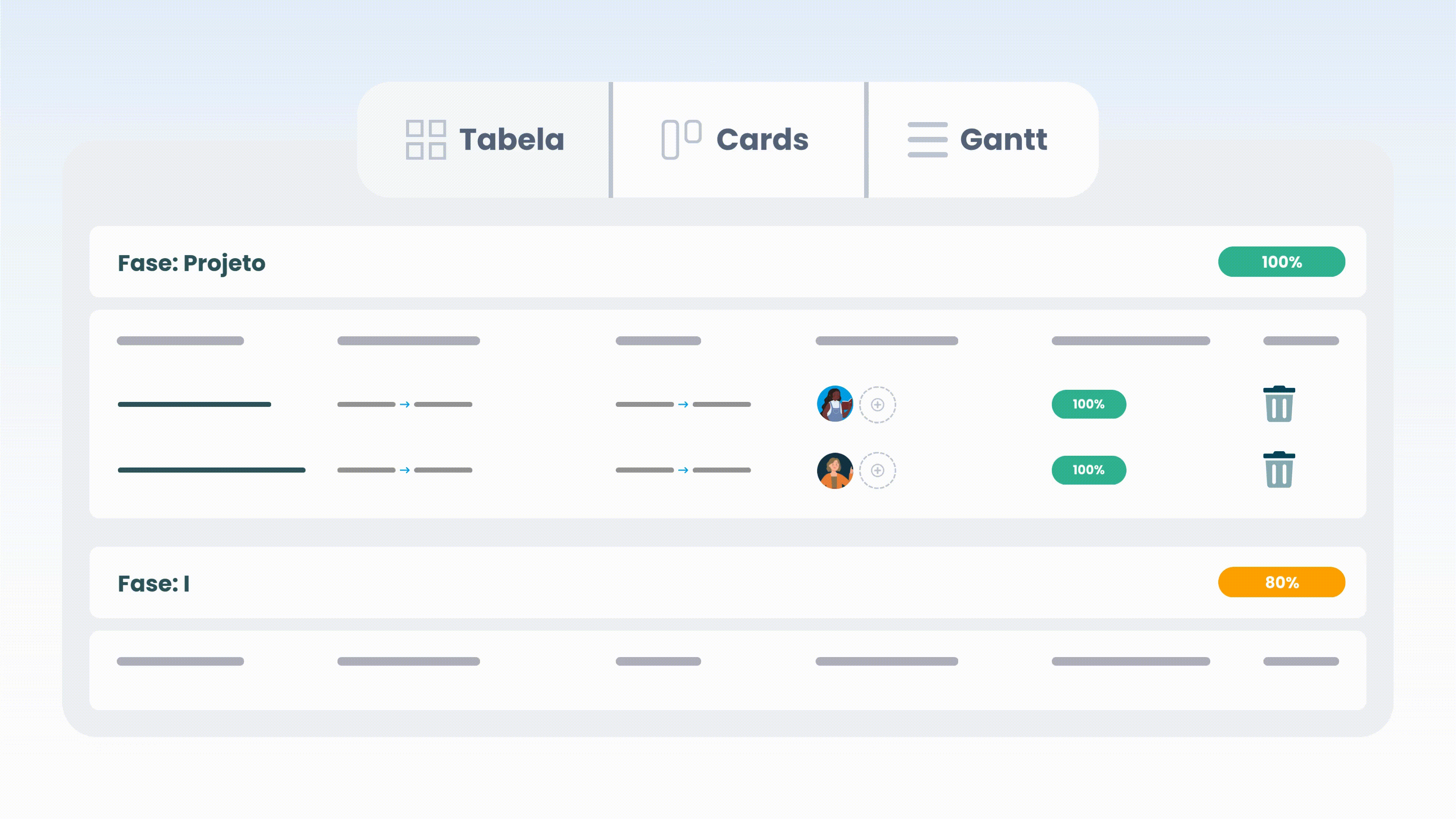 Coluna de numeração de atividades e barra de progresso colorida por fase